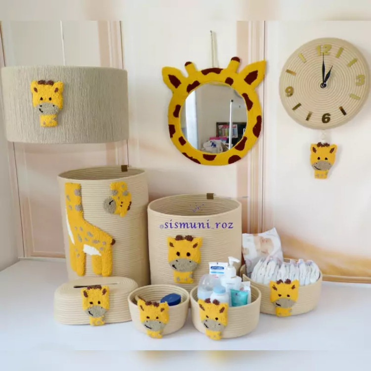 نظم دهنده سیسمونی قیطان دوزی و ساعت دیواری اتاق کودک و لوستر مکرومه کودک و آیینه دیواری زرافه پانچ دوزی (پس کرایه)