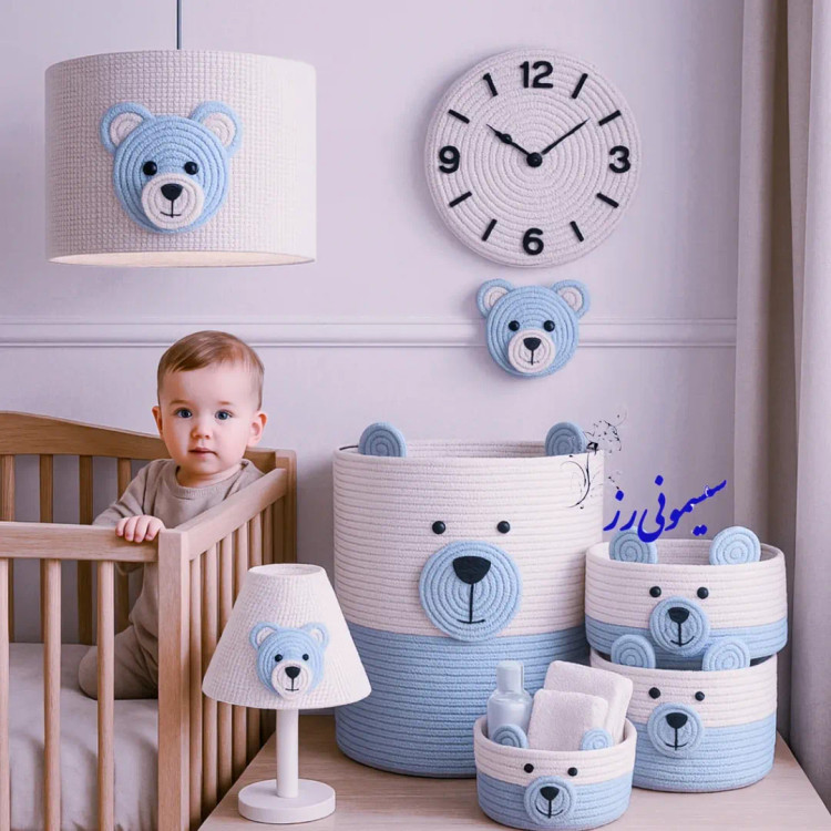 سیسمونی قیطان دوزی و نظم دهنده اتاق کودک طرح خرس آبی شیری همراه لوستر و آباژور کودک