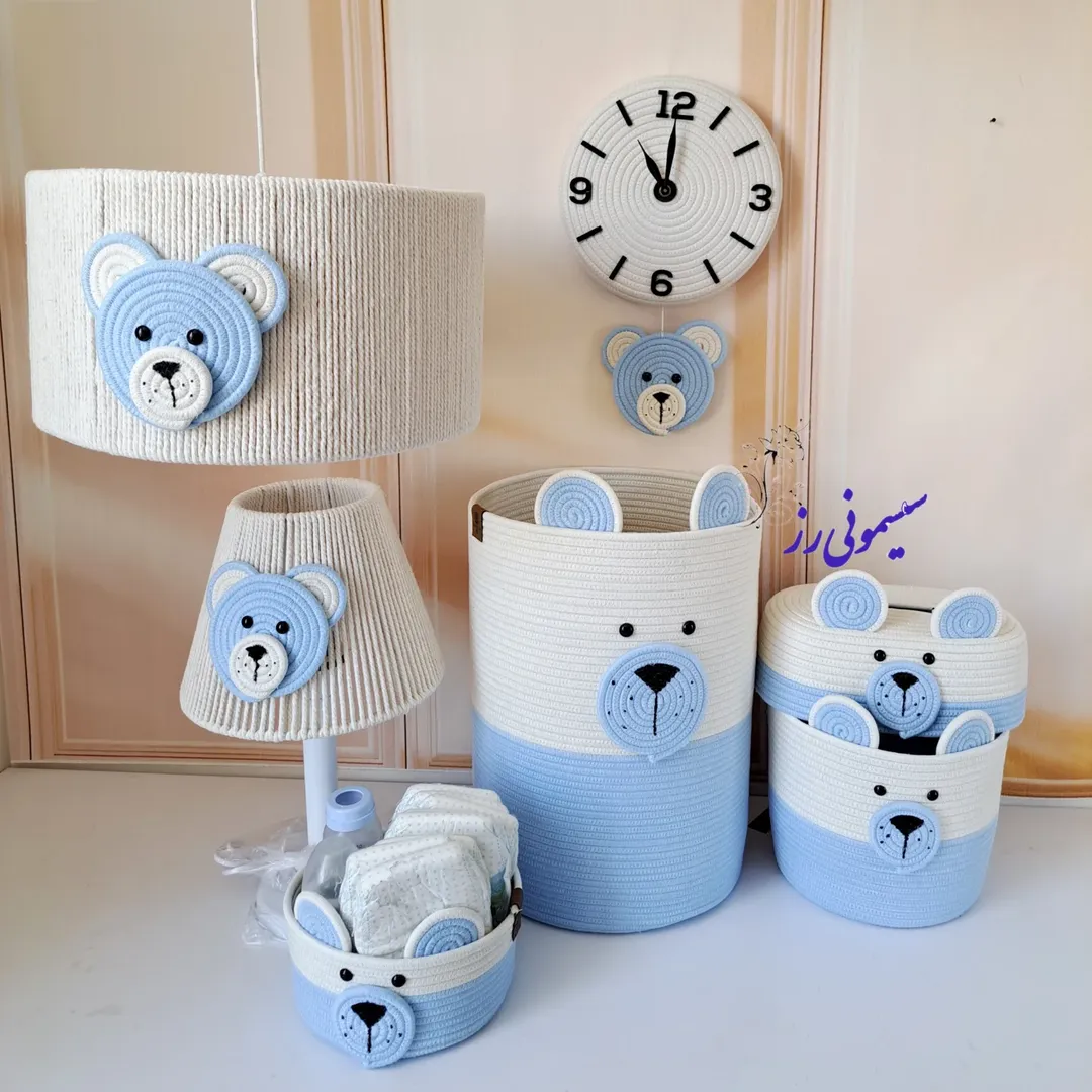 سیسمونی قیطان دوزی و نظم دهنده اتاق کودک طرح خرس آبی شیری همراه لوستر و آباژور کودک